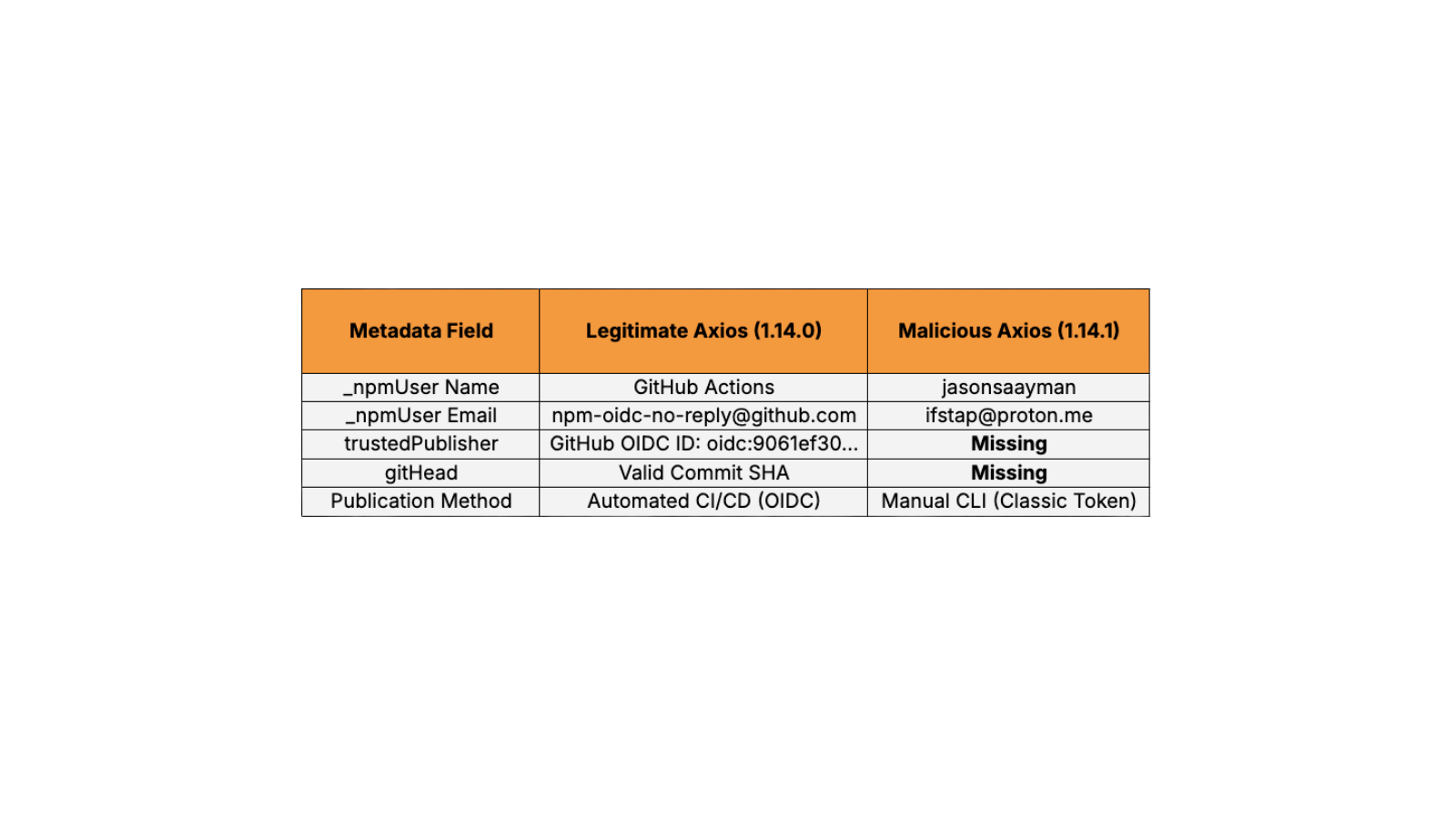 The absence of a gitHead in the malicious version is particularly telling, as it confirms that the release has no corresponding commit in the official Axios GitHub repository. This discrepancy is a critical forensic signal for developers and automated scanners to identify packages that have been published outside of a verified development process.