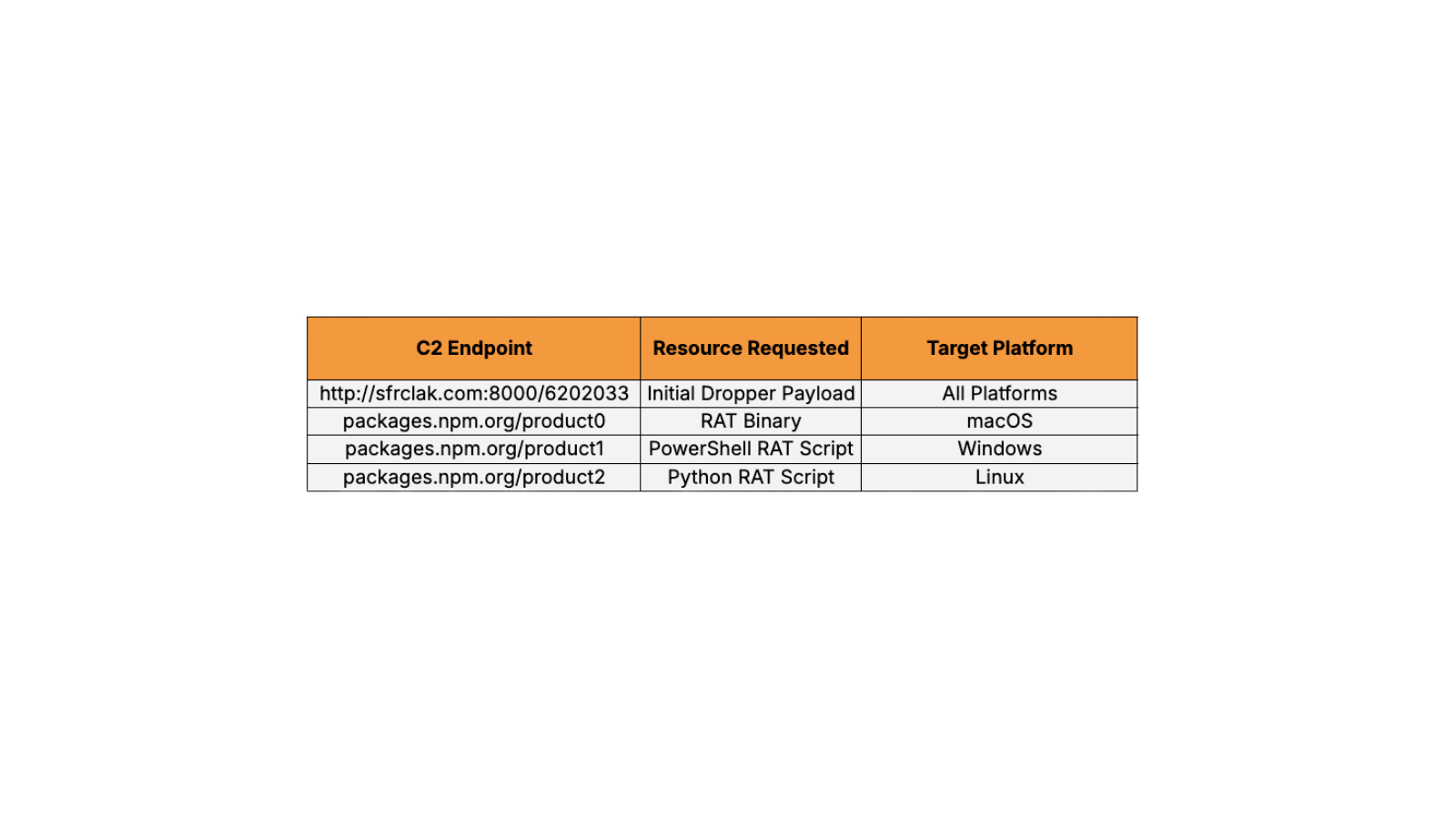 A sophisticated aspect of the C2 communication was the attempt to blend into benign network traffic. When the dropper requested the second-stage payloads, it sent a POST body containing the string packages.npm.org/product followed by a platform-specific ID (e.g., product1 for Windows). This technique is designed to deceive network defenders and automated SIEM rules that might flag connections to unknown IPs but ignore traffic that appears to be related to legitimate npm registry communication.
