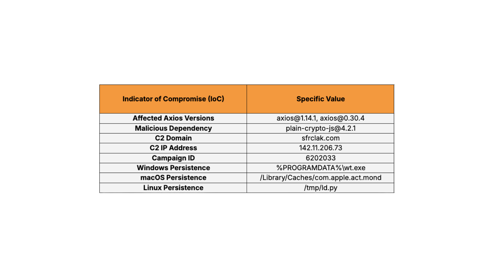 Security teams should immediately audit their environments for the affected Axios versions: axios@1.14.1 and axios@0.30.4. The primary malicious dependency is plain-crypto-js@4.2.1. Key network IoCs include the Command and Control (C2) domain sfrclak.com and the IP address 142.11.206.73, operating on port 8000. The campaign identifier used for dynamic C2 pathing was 6202033.